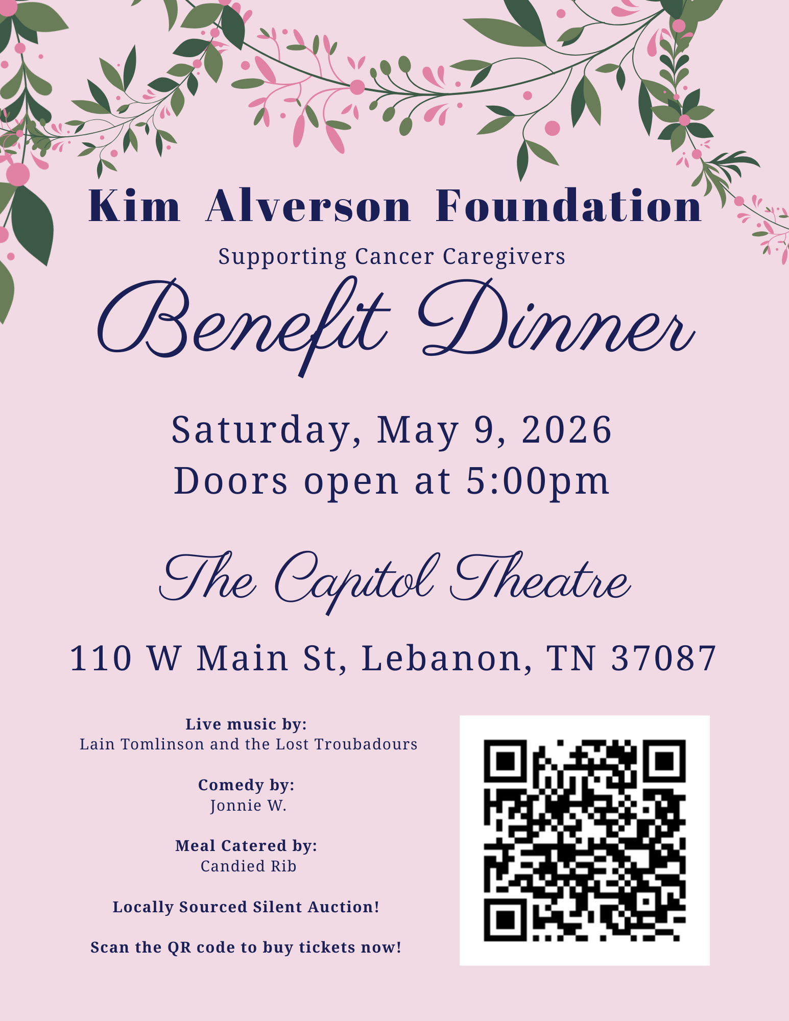 Join us at the Capitol Theatre for a night of quality entertainment and delicious food, while raising money to support cancer caregivers! Enjoy music by Lain Tomlinson and the Lost Troubadours! Also, Jonnie W. will be providing stand-up comedy. Make sure to check out our locally sourced silent auction. You don’t want to miss the second annual Kim Alverson Foundation Benefit Dinner!