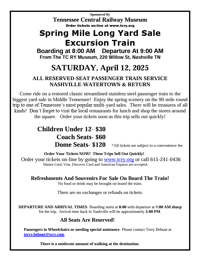 Order your tickets on-line by going to www.tcry.org or call 615-241-0436 Master Card, Visa, Discover Card and American Express are accepted.