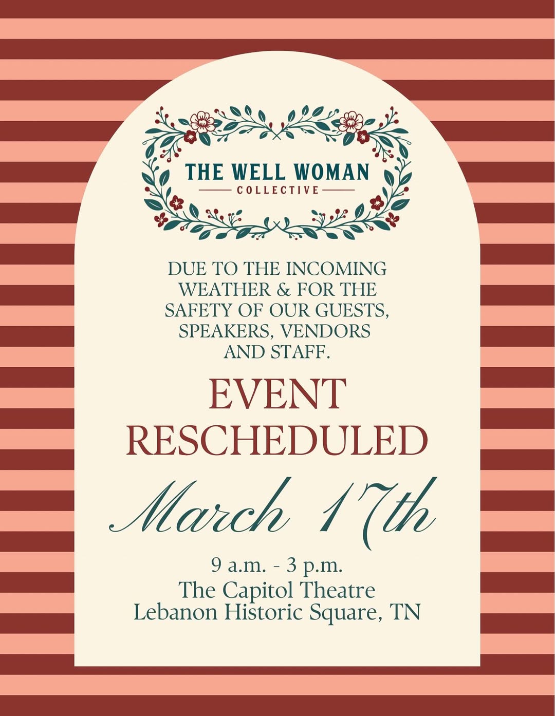 After much prayer and careful consideration, we have decided to reschedule The Well Woman Collective due to the winter weather forecast showing snow and icy conditions predicted across our area.