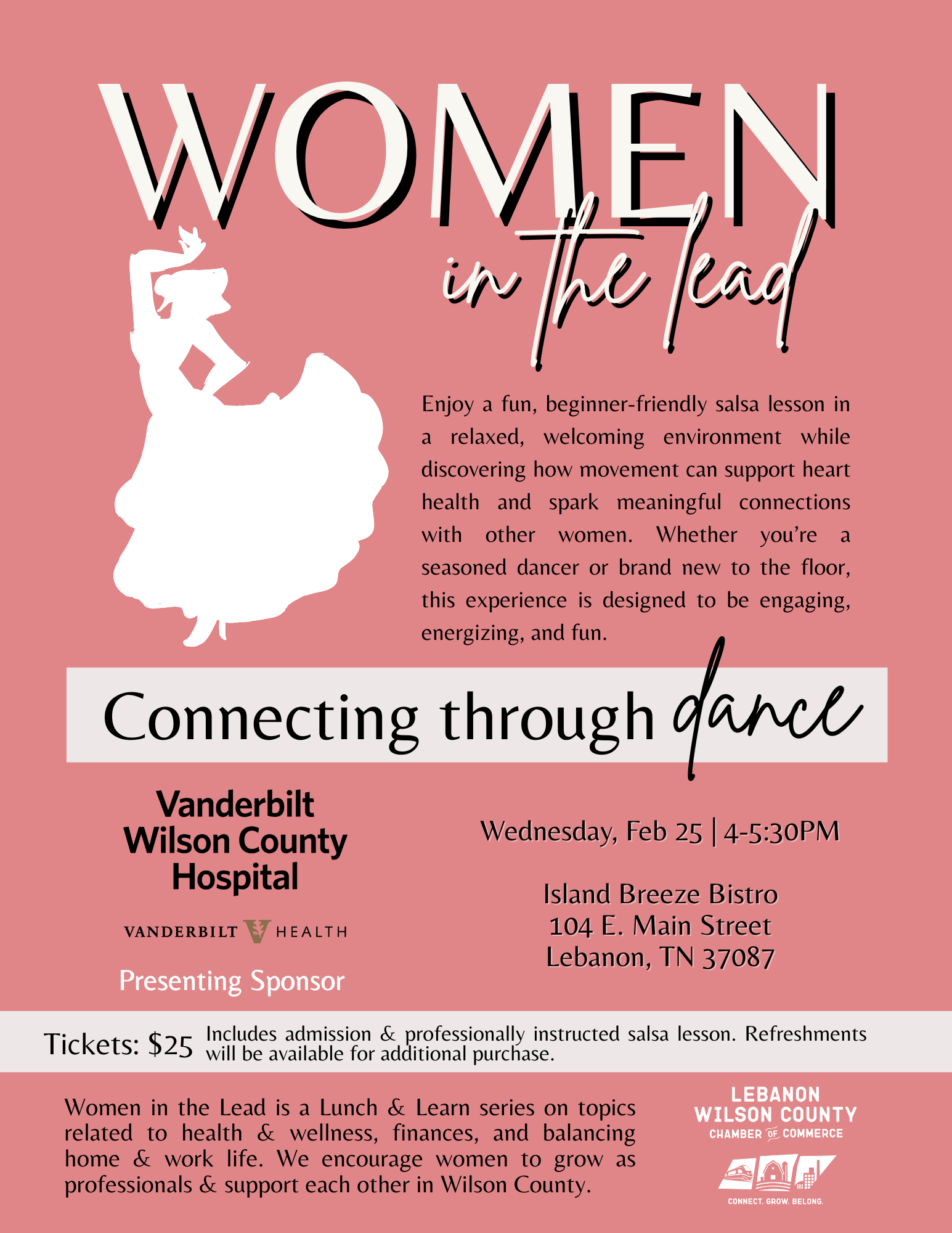 Island Breeze Bistro 104 E. Main Street, Lebanon, TNJoin us for an evening of movement, connection, and community at Women in the Lead: Connecting Through Dance. Hosted by Island Breeze Bistro, this special event invites attendees to learn the basics of salsa dancing in a relaxed, welcoming environment. More than just a dance lesson, this experience highlights how movement can support heart health […]