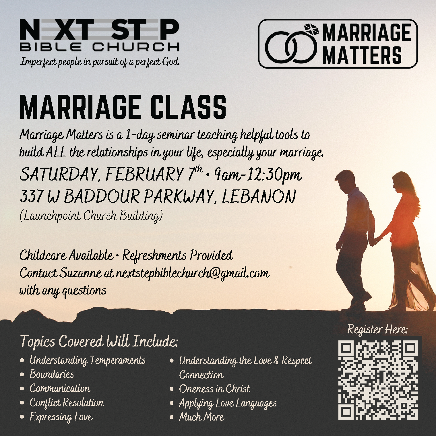 Launchpoint Church Building 337 W Baddour Parkway, Lebanon, TNMarriage Matters is a 1-day seminar, hosted by Next Step Bible Church, teaching helpful tools to build ALL the relationships in your life, especially your marriage. Topics covered will include: […]
