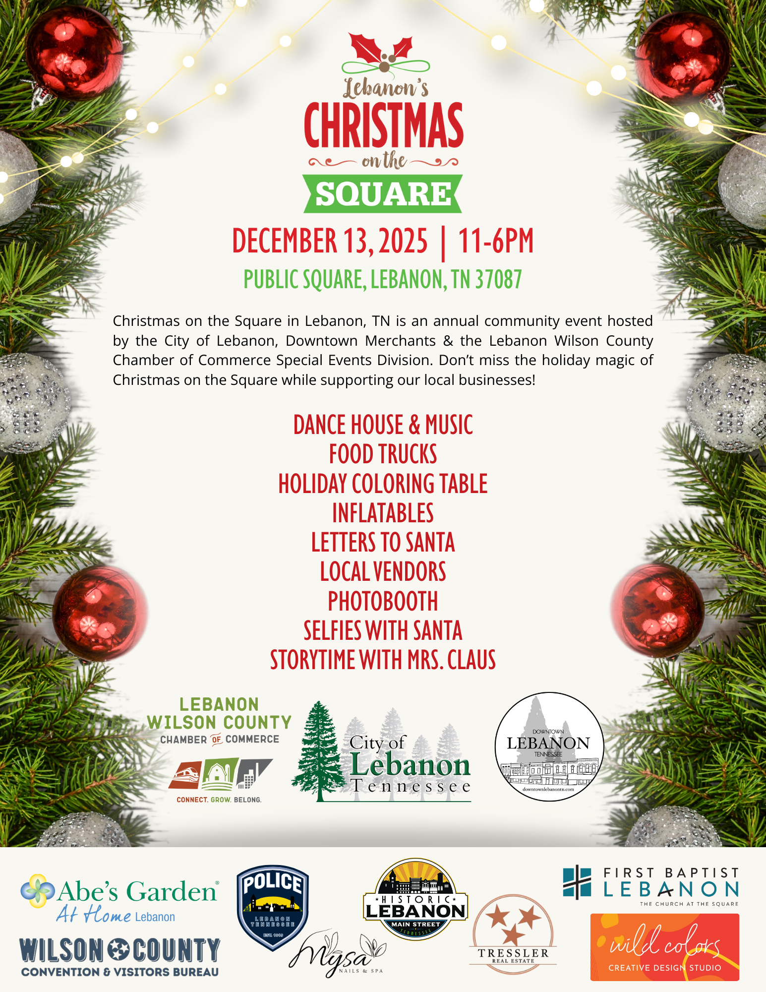 Christmas on the Square in Lebanon, TN is an annual community event hosted by the City of Lebanon, Downtown Merchants & the Lebanon Wilson County Chamber of Commerce Special Events Division. Don’t miss the holiday magic of Christmas on the Square while supporting our local businesses!