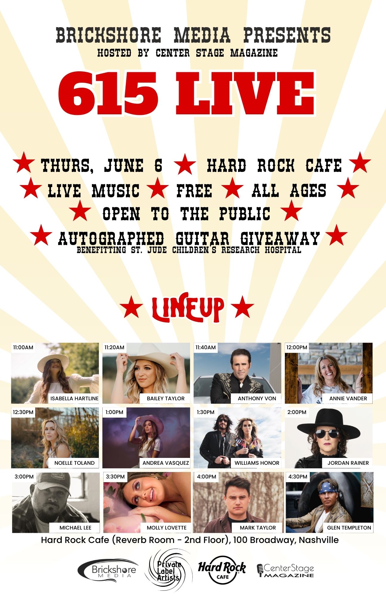 Brickshore Media, Inc. is proud to announce the 4th annual 615 LIVE Concert Series. This event, which will take place during the week of CMA Music Festival, will be held Thursday, June 6, 2024 from 11AM-5PM CT and will feature performances from some of Brickshore Media’s talented roster and friends.