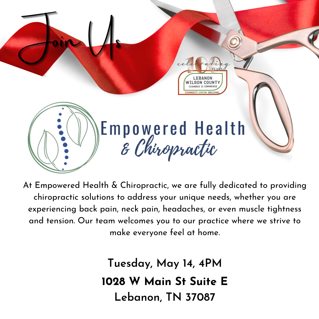 Empowered Health & Chiropractic Ribbon Cutting + Open House May 14, 2024 @ 4:00 pm - 5:00 pm CDT 1028 W Main St Suite E 1028 W Main St Suite E, Lebanon, TN At Empowered Health & Chiropractic, we serve our community with life giving care while empowering individuals to gain their full expression of health.