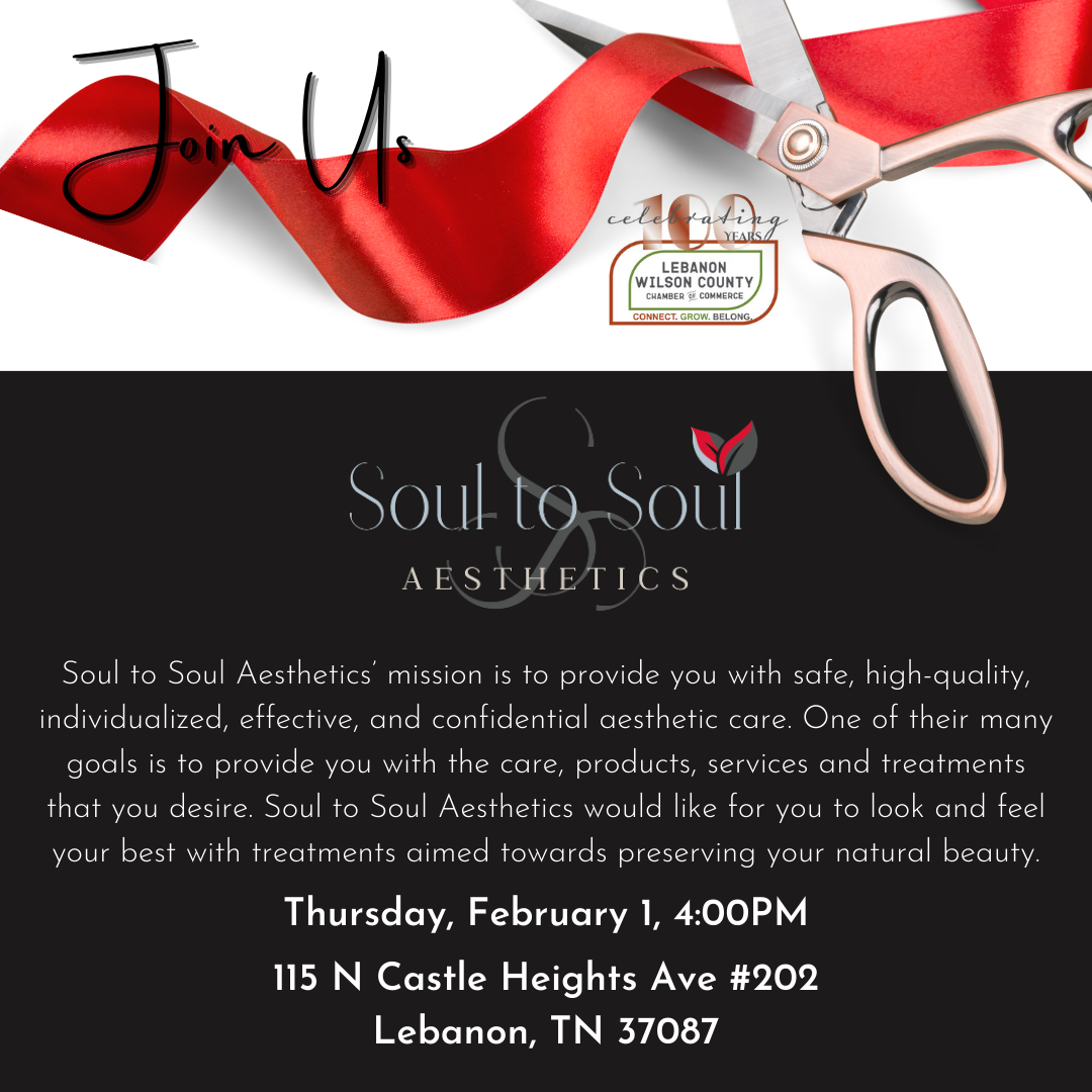 Soul to Soul Aesthetics Ribbon Cutting February 1, 2024 @ 4:00 pm - 5:00 pm CST 115 N Castle Heights Ave #202 Lebanon, TN 37087 115 N Castle Heights Ave #202, Lebanon, TN, United States