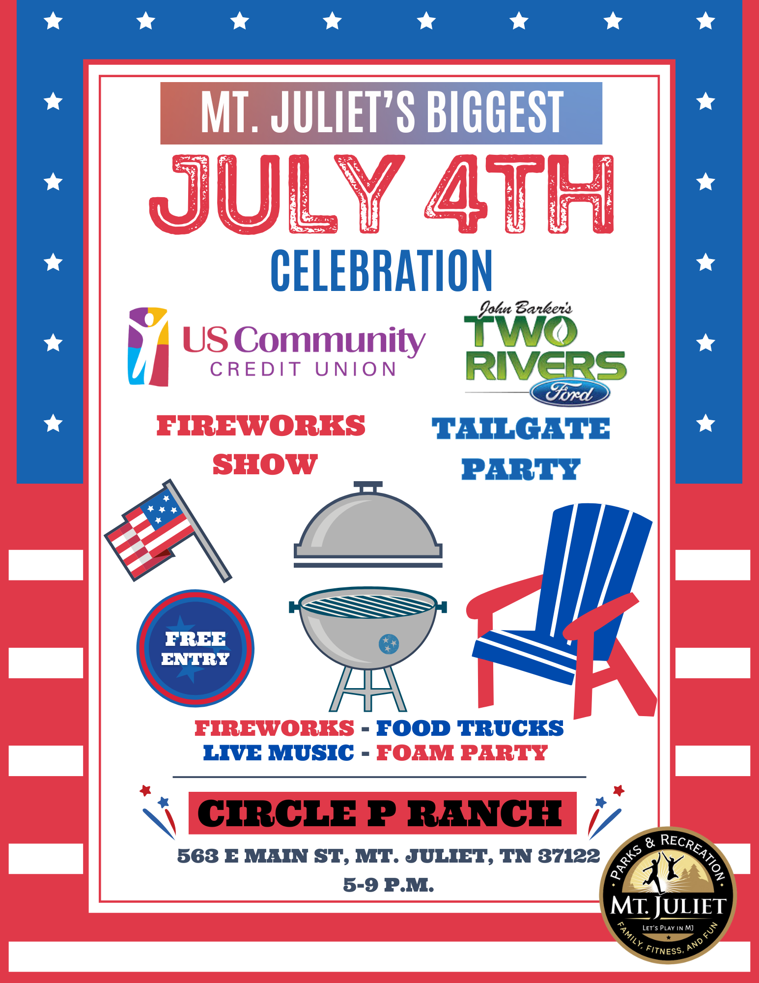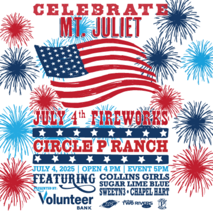 Celebrate Mt. Juliet – July 4th Fireworks July 4, 2025 @ 4:00 pm - 5:00 pm CDT Circle P Ranch East Main Street, Mt. Juliet, Tennessee, United States