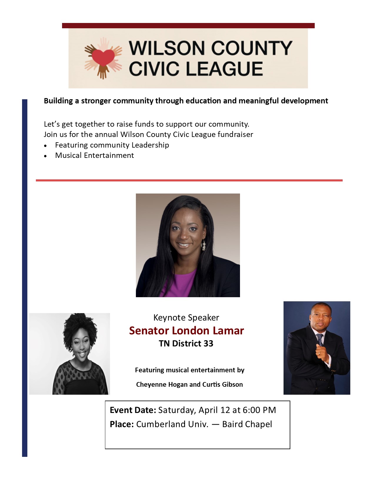 Cumberland University 1 Cumberland Dr, Lebanon, TNTickets: https://wilsoncountycivicleague.org/2025-annual-fundraiser/
