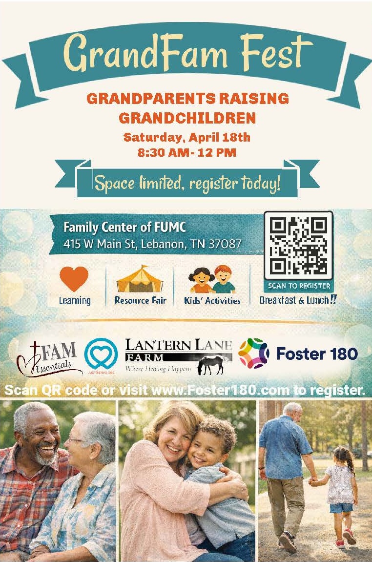 GrandFam Fest April 18 @ 8:30 am - 12:00 pm CDT Family Center of FUMC 415 W Main St, Lebanon, TN GrandFam Fest is Here! Are you a grandparent or relative raising a child? You don’t have to do this alone. Register for GrandFam Fest — a day filled with trusted […]
