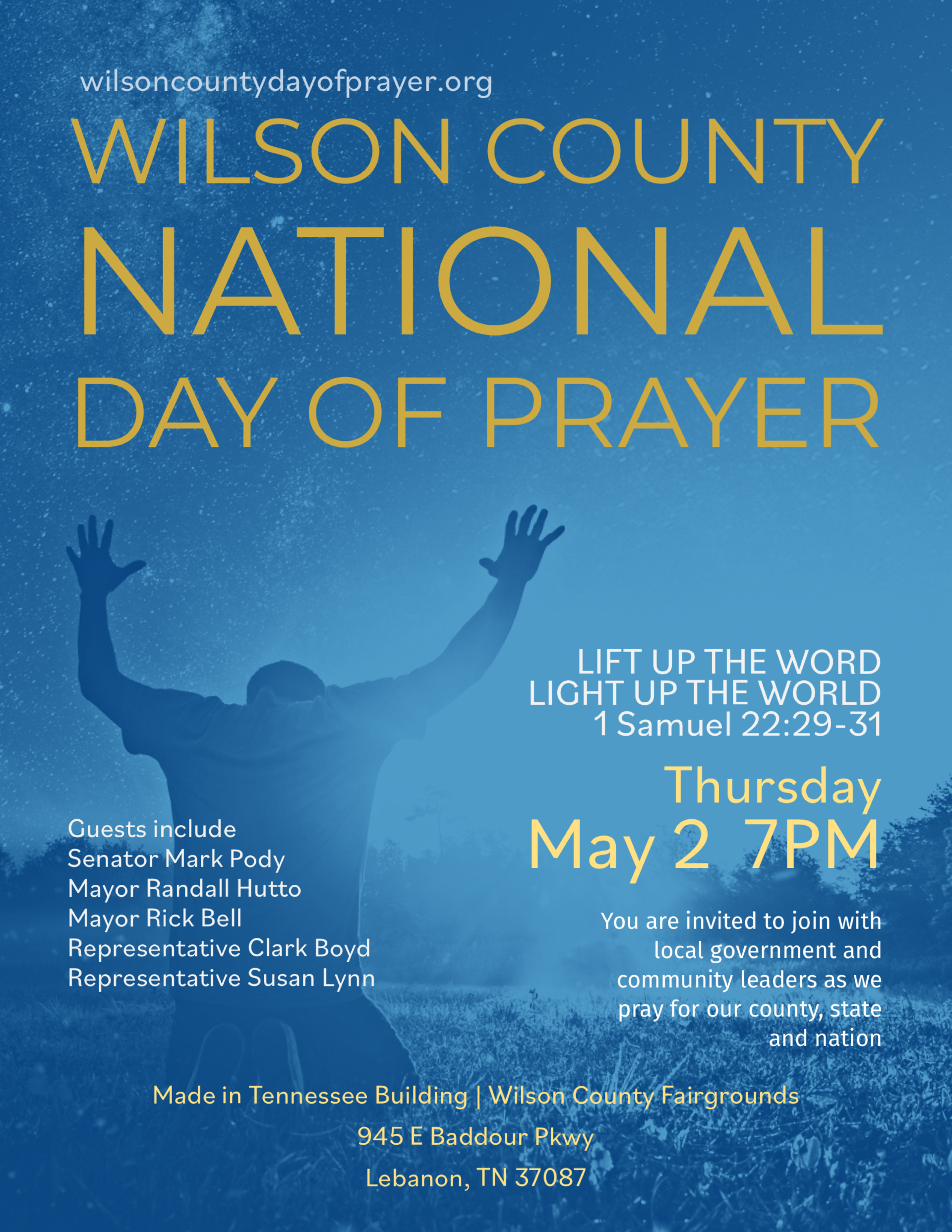 Made in Tennessee Building 945 E Baddour Parkway, Lebanon, TN, United StatesYou are invited to join with local government & community leaders as we pray for our country, state & nation. Guests include: Senator Mark Pody, Wilson County Mayor Randall Hutto, City of Lebanon Mayor Rick Bell, Representative Clark Boyd, Representative Susan Lynn